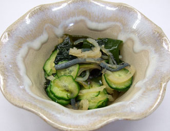 4)1)のわかめの水を切り、1)、2)、3)をボールに入れて、ポン酢を加え、