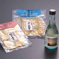 神島の写真をオリジナルプリントした、純米「神島」と「ふぐ」珍味をご用意しました。